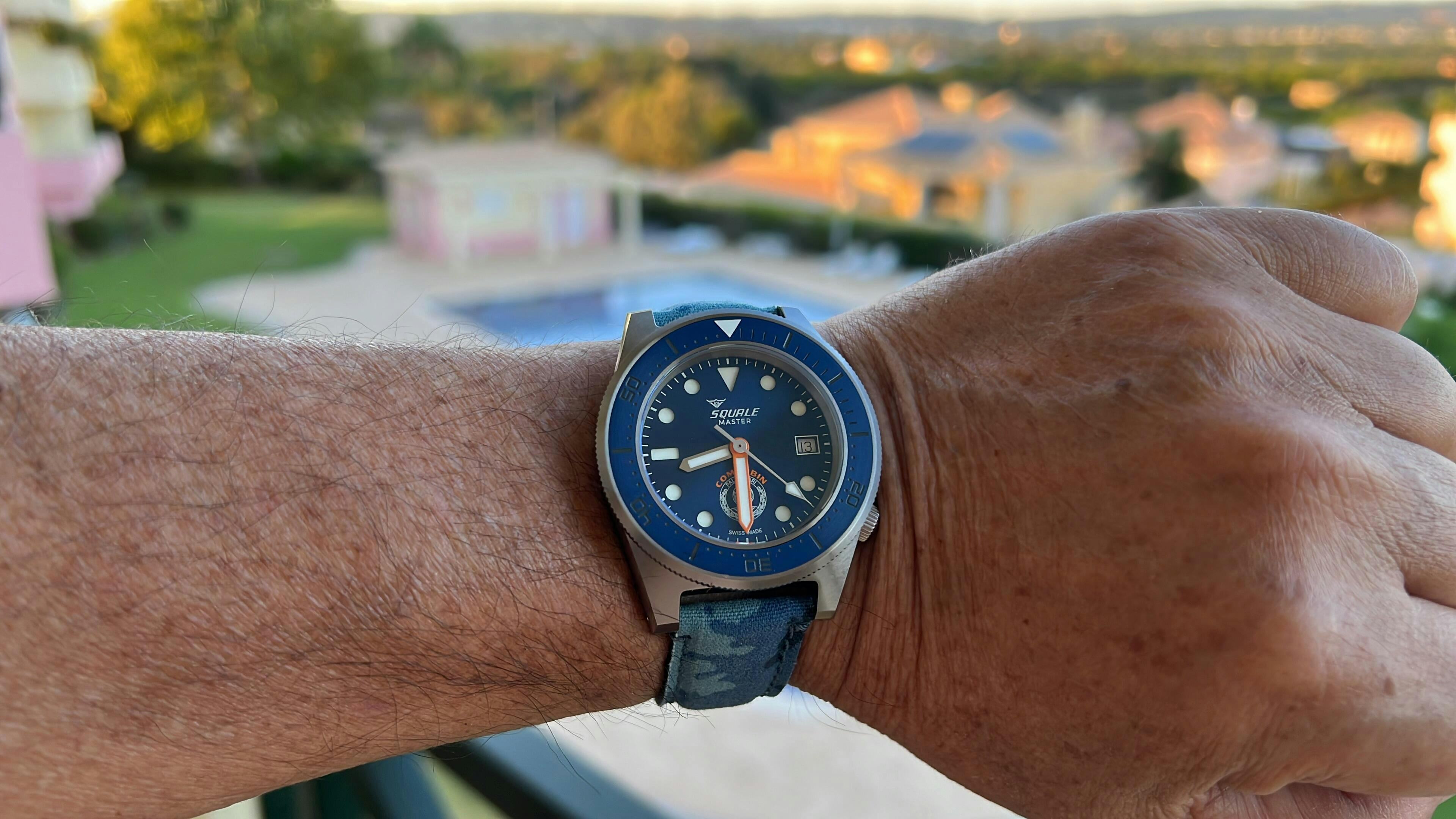 The watch itself is very modern in terms of comfort: thick sapphire crystal with an AR coating, a Sellita SW200-1 Elabore, a tremendous 1200 meters water resistance, possible thanks to the helium valve, and a very comfortable tropic rubber strap with an additional Comsubin Operational Camouflage fabric coated leather strap. A serious Swiss Made diving watch with a ton of wrist presence!
