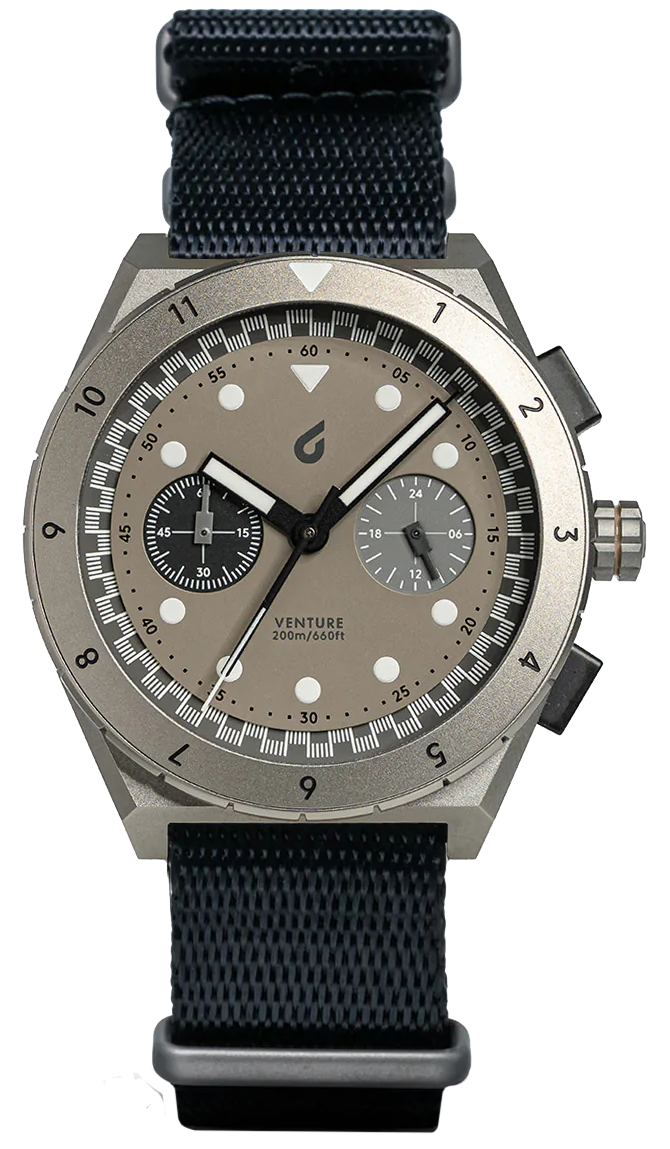 The BOLDR Venture Velo Mono is a phenomenal, sporty watch that is truly suited for any adventure, with cycling in mind. The comfort comes through the incredible lightweight titanium case and nylon strap. The watch has a Mecaquartz, Made in Japan SII VK64 movement under the hood. Featuring a chronograph funtion and a tachymeter on the dial. The tachymeter can be used to measure speed per hour over a fixed distance, or the distance travelled over a known amount of time, as well as the average amount of time an activity is done over an hour.
