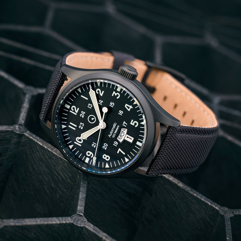 With any Field watch it's all about the basics and this watch has gotten them just right. Under the hood is an automatic NH36 movement, known for being a reliable workhorse. The nicely made 39mm case fits very nicely around most wrists, but with the 48.5mm lug to lug it does fill the wrist up nicely.Of course the watch features a sapphire crystal, is water resistant up to 100m and comes on a comfortable woven nylon/leather strap. For any more rugged adventures, the case has a durable, black, DLC coating, that will hold its own.