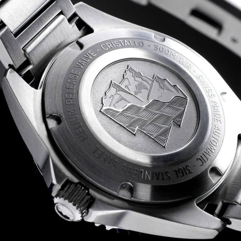 The Echo/Neutra Cristallo Professional Diver Blue is a watch truly equipped for the most extreme conditions! The 42mm case is equipped with a helium escape valve to help cope with the extreme pressure of the deep oceans, where this watch thrives with its 500m water resistance.