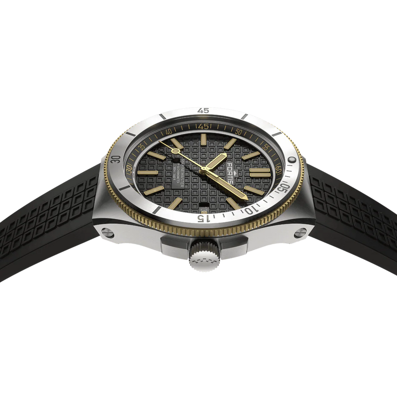 The Fortis Marinemaster combines the best quality materials, finest craftmanship and well considered details. A recycled stainless steel case encapsulates and protects the beating heart. The bi-directional Gear Bezel, a proprietary bezel developed by Fortis adds a new level of grip and functionality. The bezel also features a patent pending Fortis Lock System, which allows the bezel to turn in both directions and lock the bezel to stop it from turning unnecessarily.