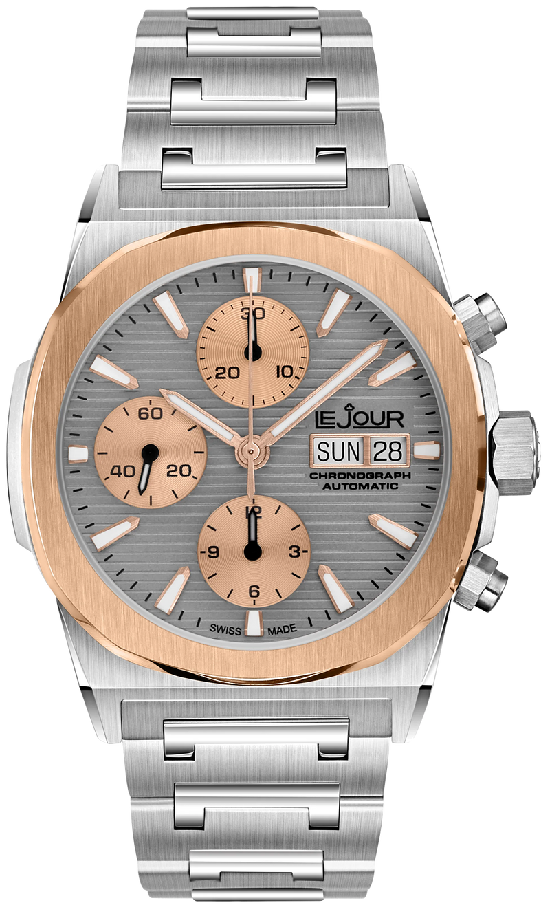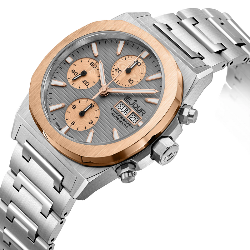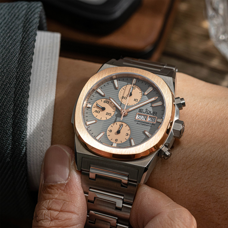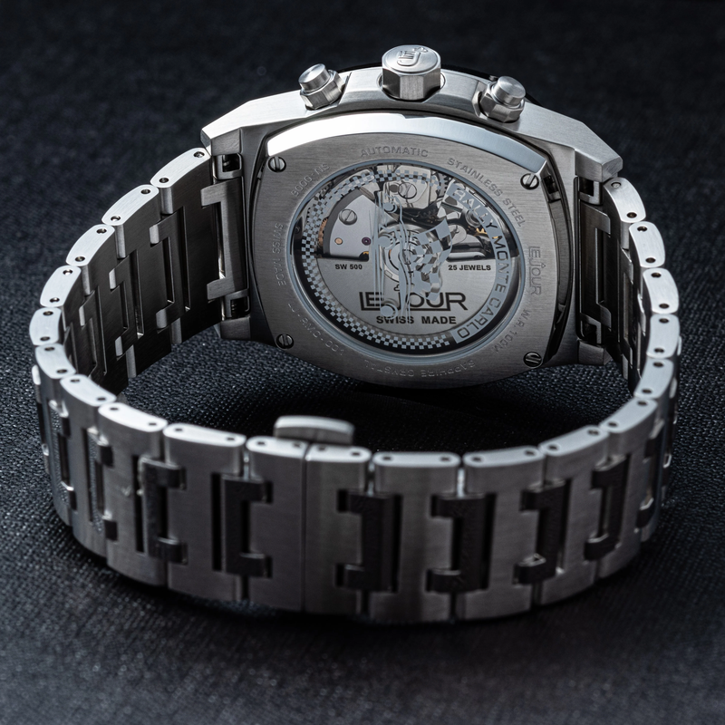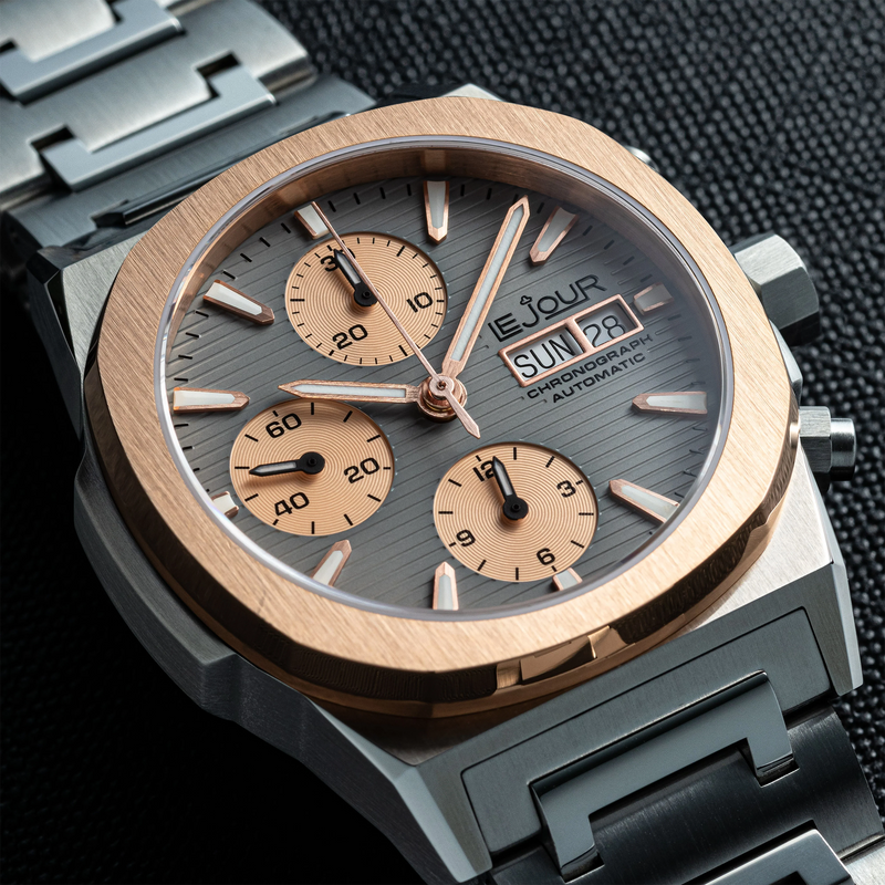 The Le Jour Rally Monte-Carlo LJ-RMC-007is an incredible automatic (mechanical) Swiss Made chronograph. Under the hood you'll find a trusty Sellita SW500 movement, but the other specifications are also as you'd expect from a Le Jour: flat sapphire glass with an AR coating, 100m water resistance and a high level of finishing. The bezel compliments the squared off shape of the case beautifully. With an understated 40mm diameter, 48mm lug-to-lug and a 14.5mm height the watch has pleasant wrist presence, while not losing any elegance and class. The stainless steel bracelet tapers beautifully from 22mm at the lugs to 18mm at the butterfly clasp, adding to the daily wearability.