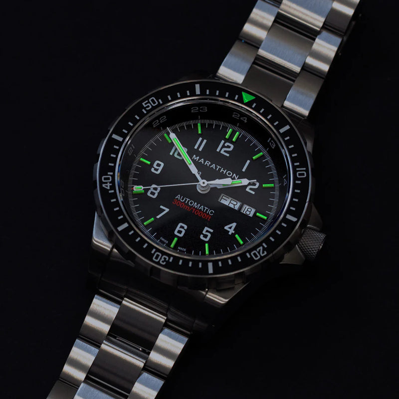 Under the hood is a reliable, automatic, Swiss Made Sellita SW220 movement and bringing an extra layer of comfort is Marathon's amazingly comfortable metal bracelet, which is military grade and also supplied to the U.S. Government and features a diver extension.