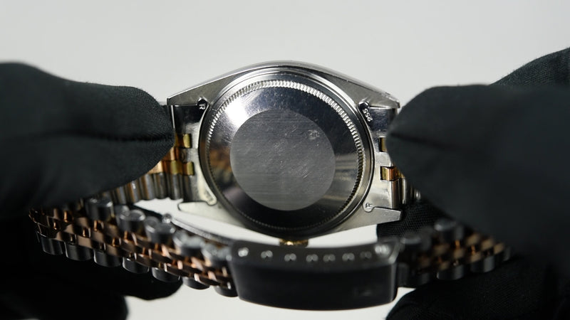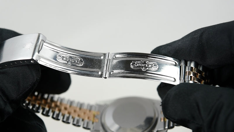 The Rolex Datejust 1601 (Pre-owned) is a watch in good vintage condition with normal signs of wear and comes as the watch only. Based on the serial number this watch dates back to 1973 and it is good to note that the watch was originally steel / rose gold. Over the years and during maintenance some parts were replaced, as rose gold parts were very hard to come by. The bracelet center links and bezel are still rose gold, but 1 of the end links and the dial and hands are yellow gold.