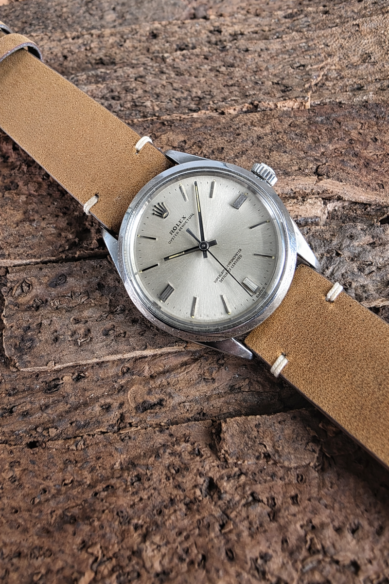 The Rolex Oyster Perpetual 1002 (Pre-owned) is a watch in good vintage condition with normal signs of wear and comes with the no box or papers. The watch comes on a new handmade leather strap (aftermarket). The serialnumber dates this watch back to 1971.