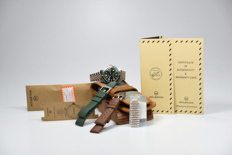 The Wolbrook Skindiver Automatic Two-Tone Green (Pre-owned) is a watch in like new condition and comes with the full set with box and papers (03/02/2025). The watch also comes with 2 fitting rubber straps.