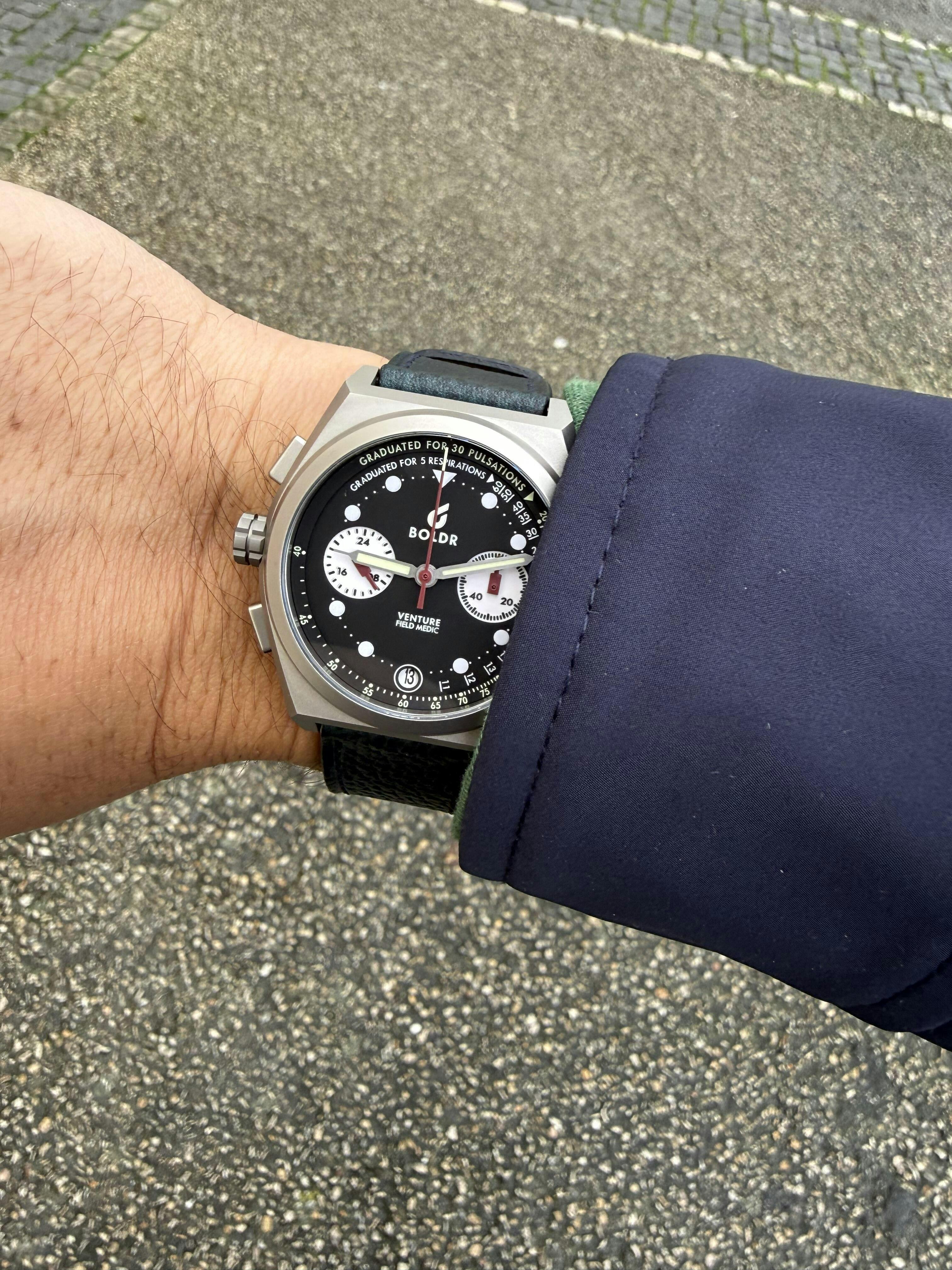 The watch is also up to nearly every challenge due to the 200m water resistance and sapphire crystal. The dial stands out with the reverse panda colour scheme and red accents.