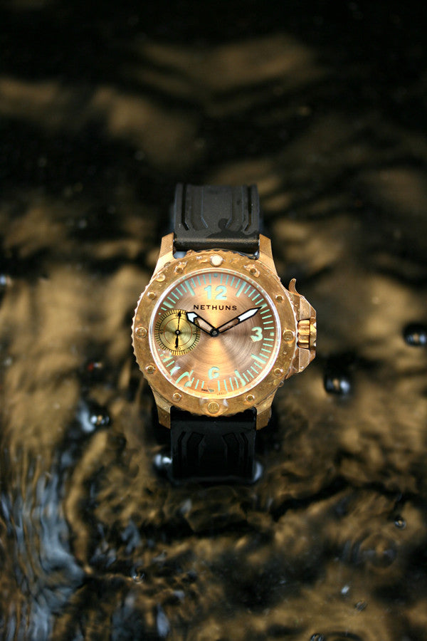 The Nethuns No. 5.1.1.7.01 is a spectacular Swiss Made bronze watch. The most obvious perk of the watch is the material: it's entirely made from CuSn8 bronze. Bronze has the great attribute that it builds up a layer of patina. This is an ongoing process which makes every watch unique. Discolouration is normal with this material. One major benefit is that you can largely bring back your watch in the original condition by using a Cape Cod cloth. Under the hood you will find a Swiss Made ETA6497 handwinding movement. The dial is protected by 4.4mm thick sapphire glass, which helps with the impressive 300m water resistance.